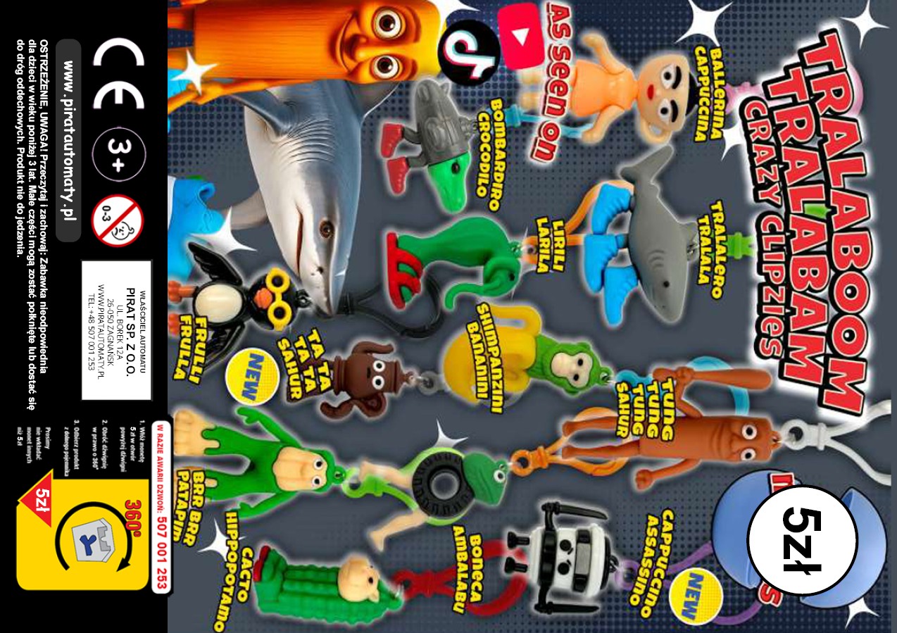 Poznaj zabawne figurki z viralowych filmików – wśród nich m.in. Tralabro Tralia, Ta Ta Ta Tasaur, Shimpanzini Banamini, Bombardiro Crocodilo i wiele innych! Każda postać ma zawieszkę, dzięki której możesz przypiąć ją do plecaka, kluczy lub torby.